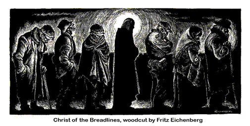 Another great, and in the best sense, I would say, iconic representation of Christ is also linked with radical Catholicism. This is the woodcut “The Christ of the Breadlines” by artist Fritz Eichenberg. The picture, which was created for and has become identified with the Catholic Worker movement, shows a Depression-era lineup of hurting people waiting in line for some food. Standing in the midst of the line is a humble looking character clearly recognizable as Jesus.